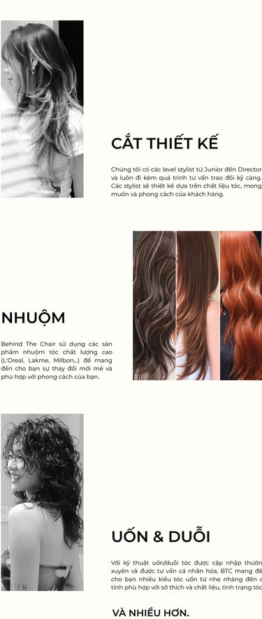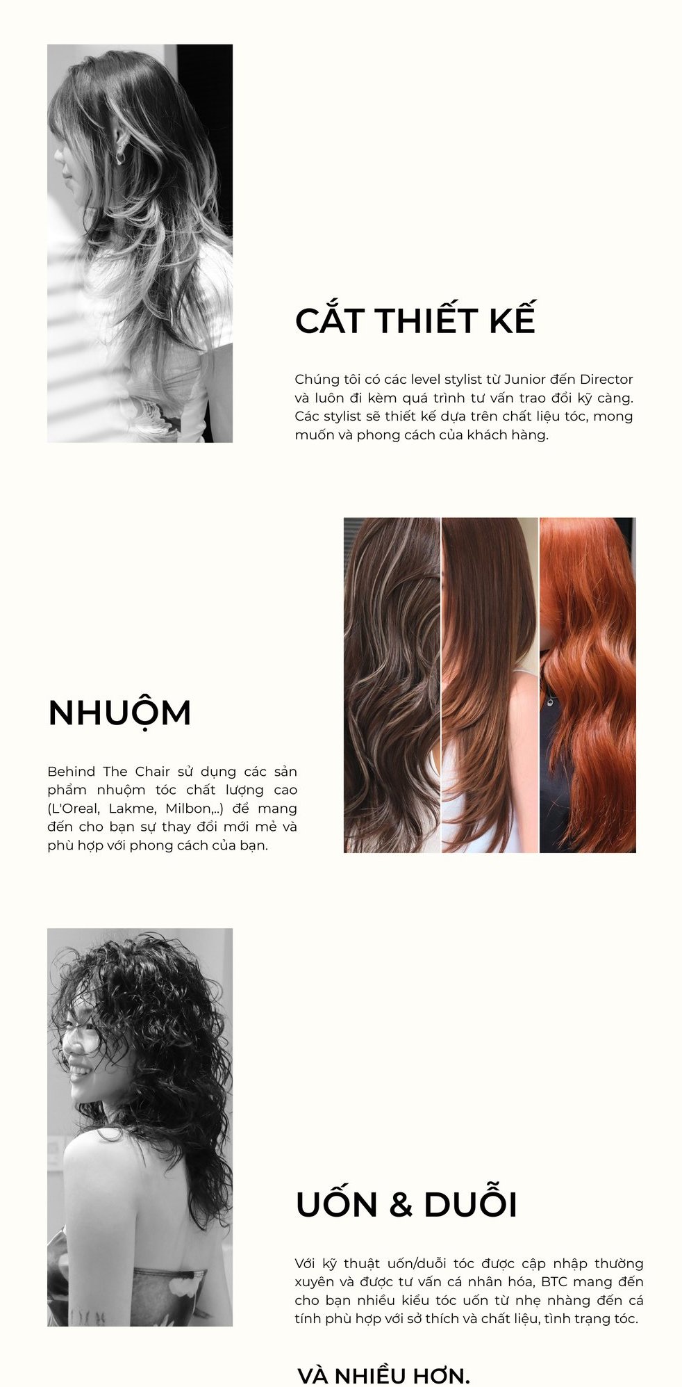 Behind The Chair được thành lập từ tháng 10/2020. "Phía sau chiếc ghế" thể hiện triết lý làm nghề của chúng tôi : phía sau mỗi mái tóc đẹp là một stylist tận tâm, giàu kinh nghiệm và đầy đam mê. Đội ngũ được tuyển chọn kỹ lưỡng, dẫn dắt bởi chuyên gia tạo mẫu tóc :